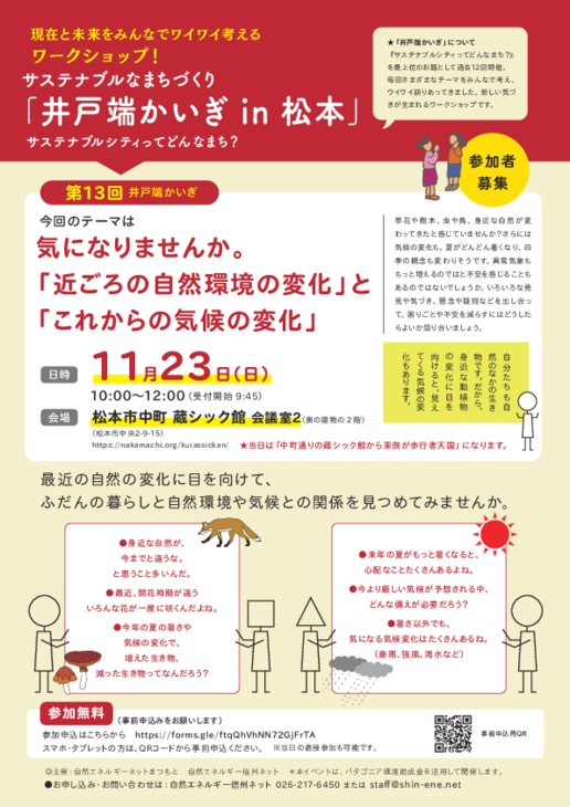 今回はイベントは行いませんが、蔵シック館で、「自然エネルギーネットまつもと」と「自然エネルギー信州ネット」の主催で、サステナブルなまちづくり 井戸端かいぎ第13回「気になりませんか。近ごろの自然環境の変化とこれからの気候の変化」 が行われます。