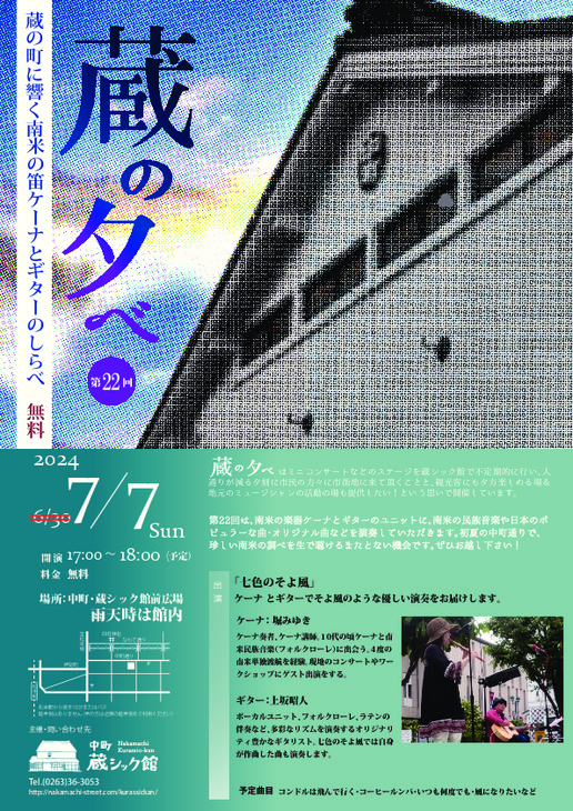 6/30の予定でしたが、雨の予報のため7/7(日)に延期します。当日雨の場合は蔵シック館内で行います。館内の場合、開場は16時半(開演は17時~)となります。