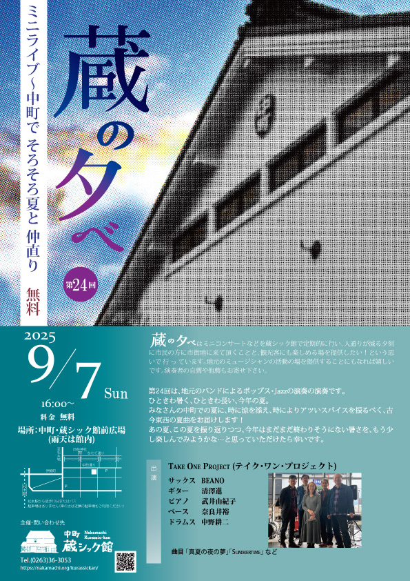 市民の方に中町に来て頂くことと、観光客にも楽しめる場を提供したい!という目的で、ミニライブを蔵シック館で不定期に行っています。地元のミュージシャンの活動の場を提供することにもなればと思います。「楽都松本」らしい音楽をお楽しみ下さい。